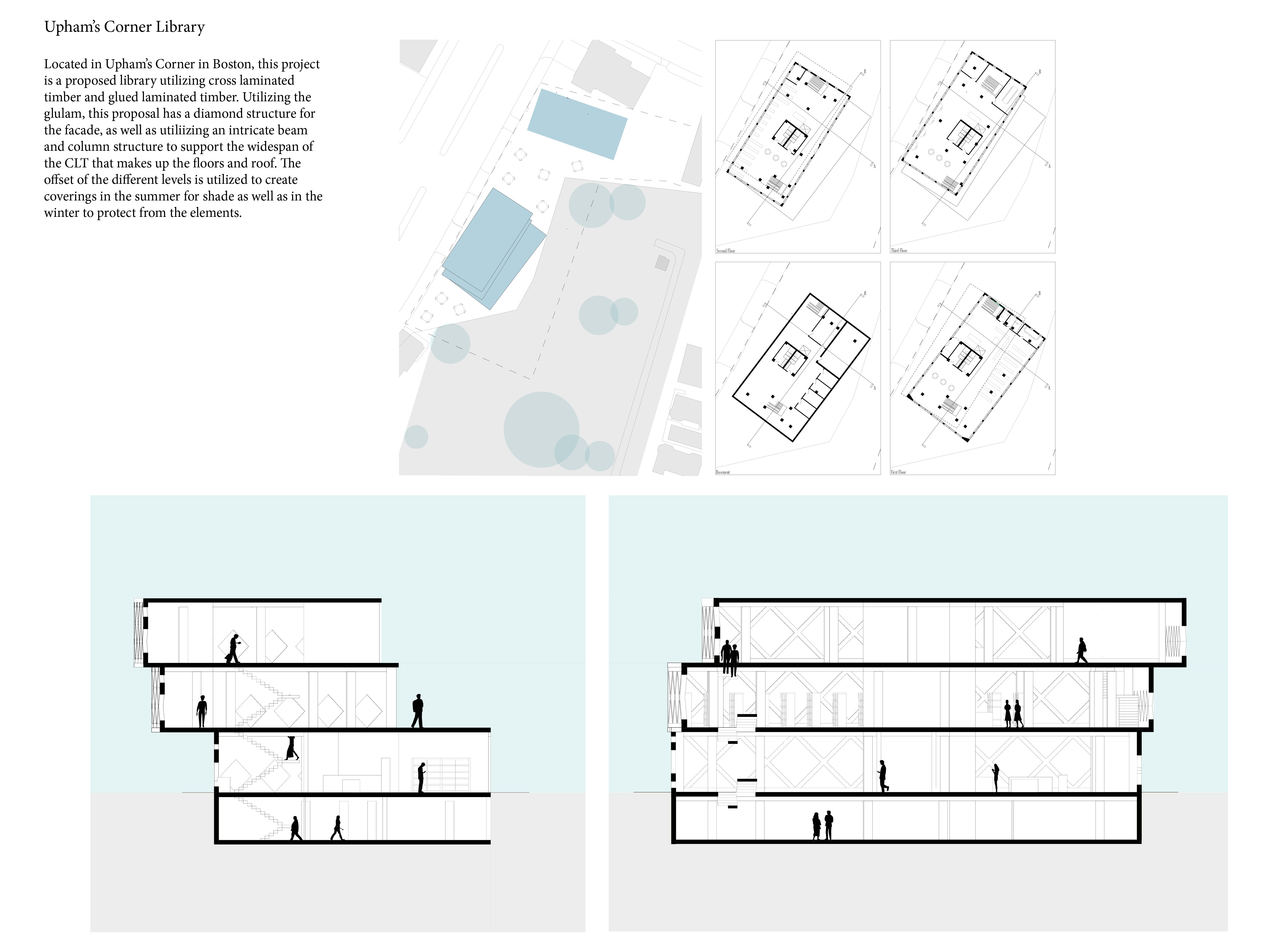 Located in Upham's Corner in Boston, this project is a proposed library utilizing cross-laminated timber and glued laminated timber. Utilizing the glulam, this proposal has a diamond structure for the facade, as well as utilizing an interlace beam and column structure to support the widespans of the CLT that makes up the floors and roof.